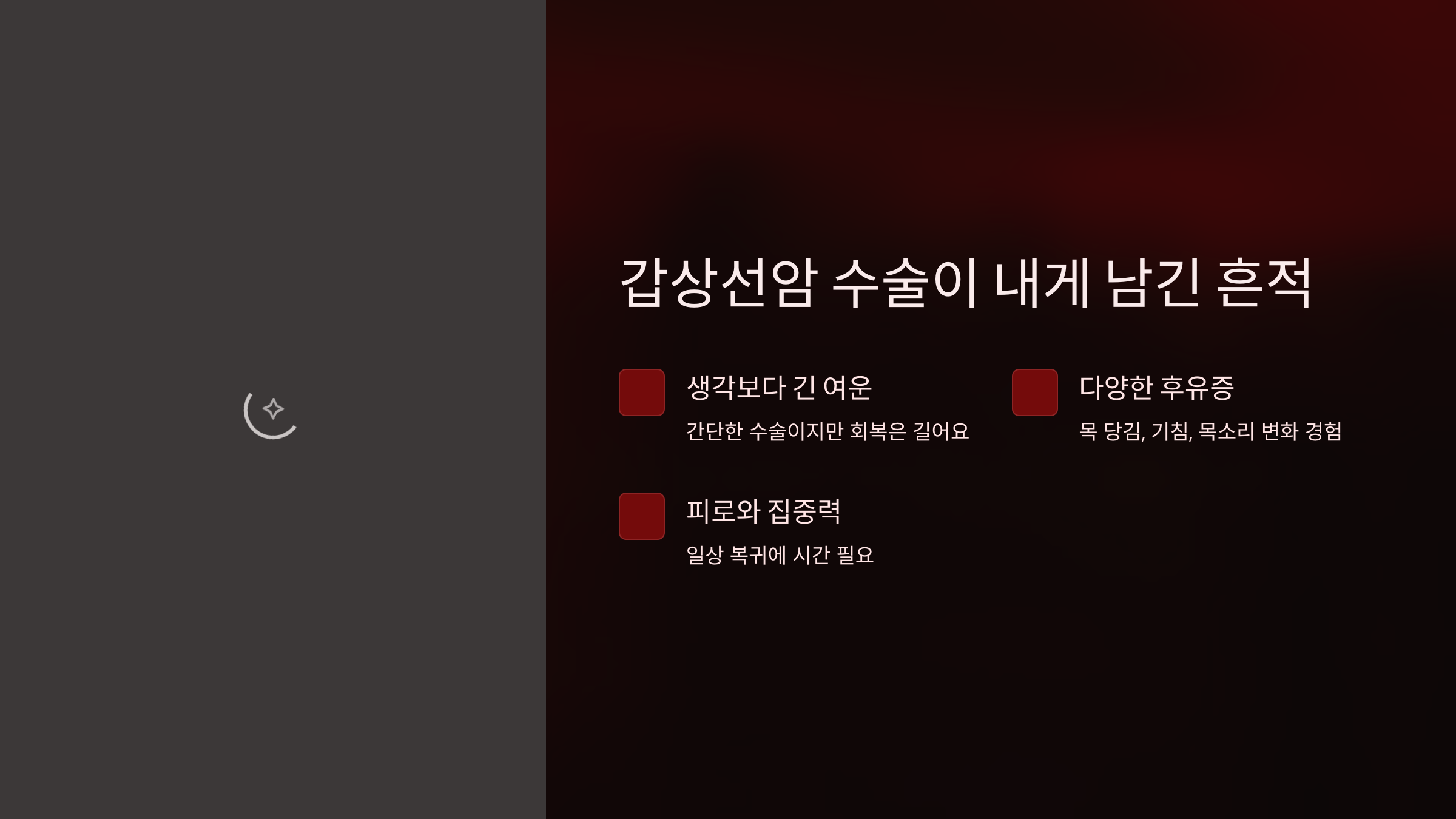 갑상선암 수술은 생각보다 간단한 수술일 수 있지만, 그 여운은 꽤 길게 남습니다. 저는 전절제 수술을 받은 후 목의 당김과 기침, 목소리 변화 등 다양한 후유증을 겪었습니다. 단순히 "수술만 끝나면 괜찮겠지"란 생각은 오산이었어요. 특히 회복 기간 중에는 피로감과 집중력 저하가 많아서, 일상으로 돌아가는데 시간이 걸렸습니다.