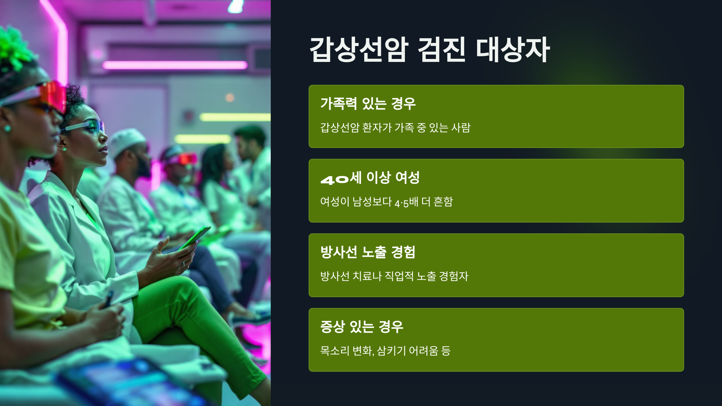 갑상선암 검진은 특정 증상이 없더라도 정기적으로 체크하는 것이 중요해요. 특히, 아래와 같은 경우라면 더 신경 써야 합니다.