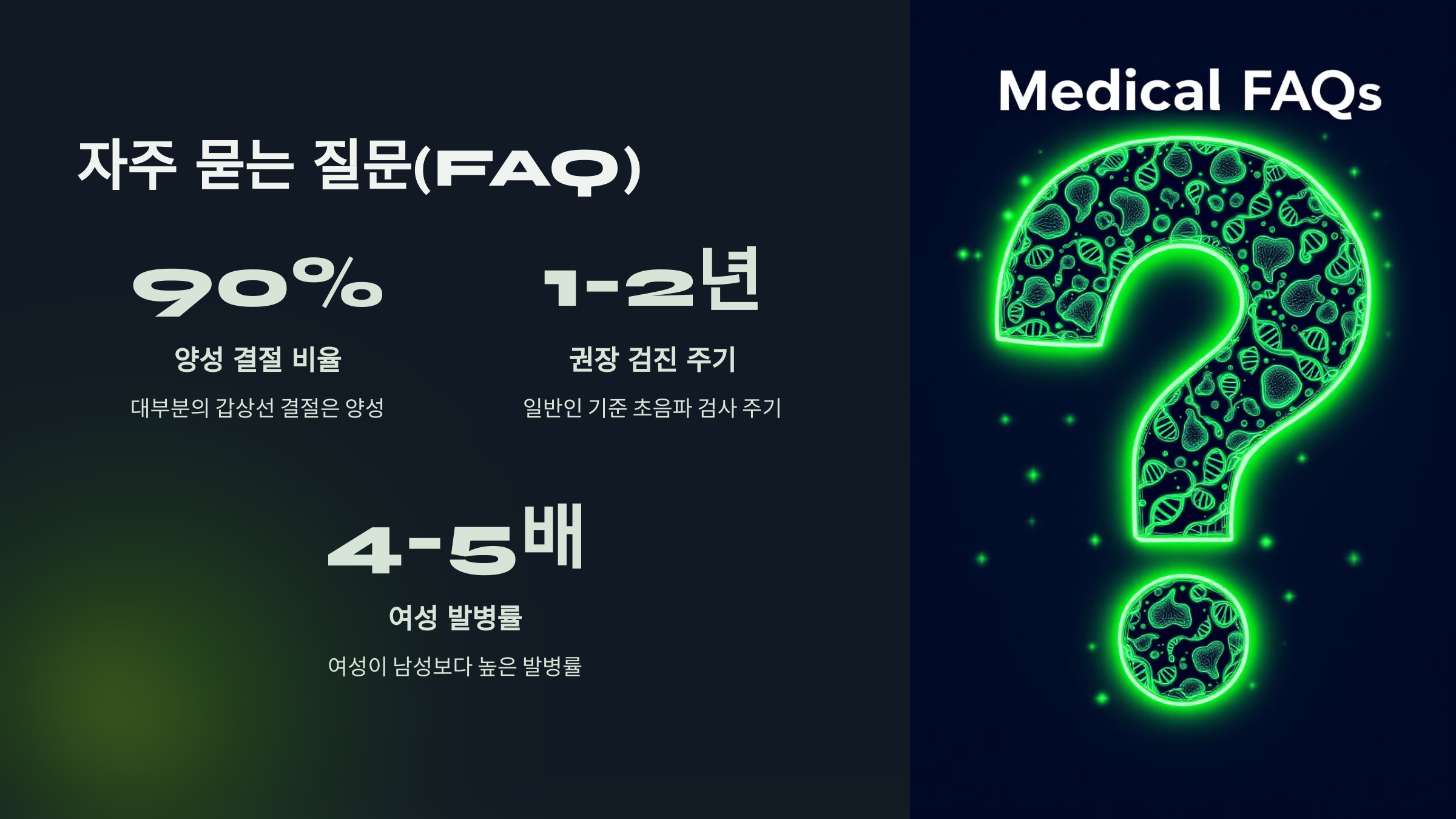 - 고위험군(가족력, 방사선 노출 등)은 매년 건강검진 필수.