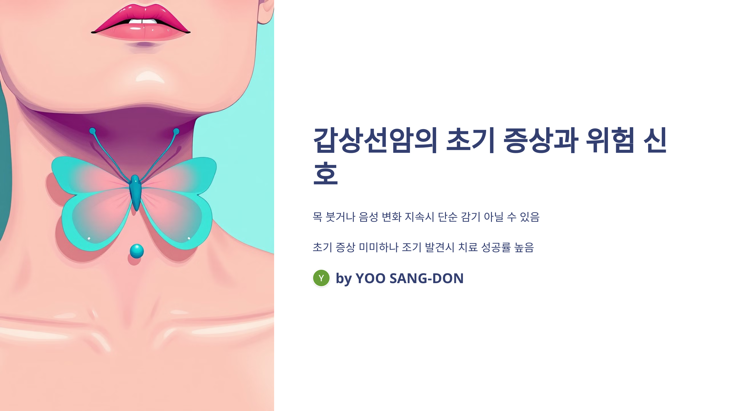 목이 붓거나 음성이 변하는 증상이 지속된다면 단순한 감기가 아닐 수도 있습니다. 갑상선암은 초기 증상이 미미해 쉽게 지나치기 쉽지만, 조기에 발견하면 치료 성공률이 높아집니다. 오늘은 갑상선암의 초기 증상과 절대 무시하면 안 되는 위험한 징후들에 대해 자세히 알아보겠습니다.