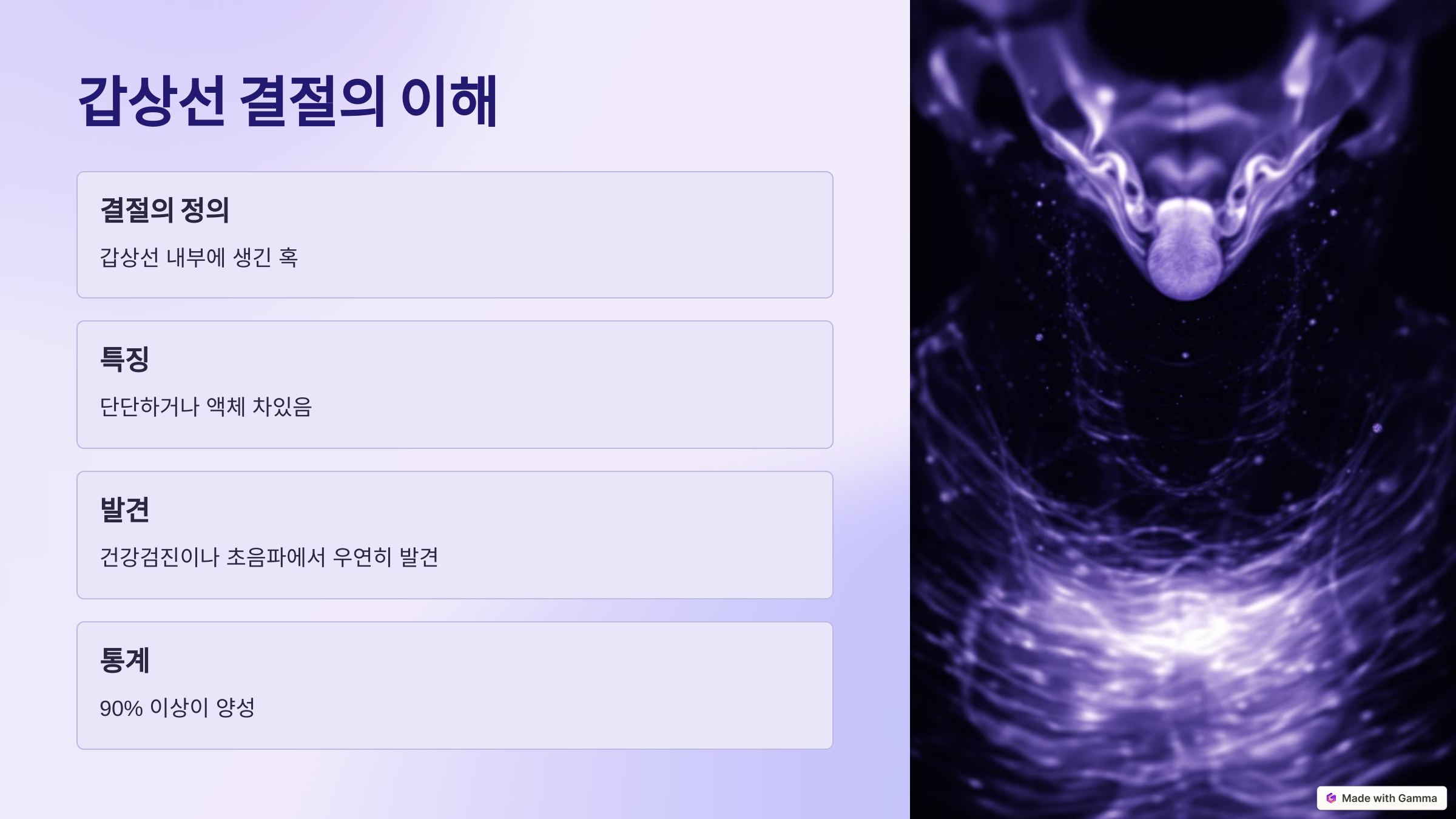 갑상선 결절은 갑상선 내부에 생긴 혹을 의미합니다. 결절은 단단할 수도 있고, 내부에 액체(낭종)가 차 있는 경우도 있어요. 보통 결절 자체는 특별한 증상을 유발하지 않으며, 건강검진이나 초음파 검사 중 우연히 발견되는 경우가 많아요.