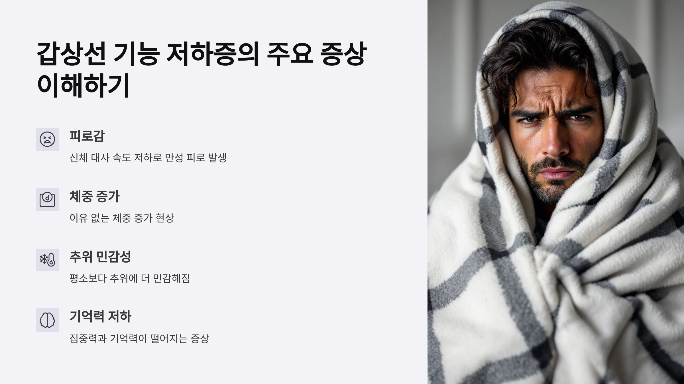 갑상선 기능 저하는 신체 대사 속도를 떨어뜨려 여러 가지 불편함을 유발해요. 대표적인 증상은 피로, 체중 증가, 추위에 민감해짐, 피부 건조, 기억력 저하 등이에요. 저도 처음엔 겨울만 되면 너무 추위를 타고, 이유 없이 부쩍 살이 찌길래 이상하다고 느꼈어요. 병원에서 피검사를 받고 나서야 갑상선 문제라는 걸 알게 되었죠.