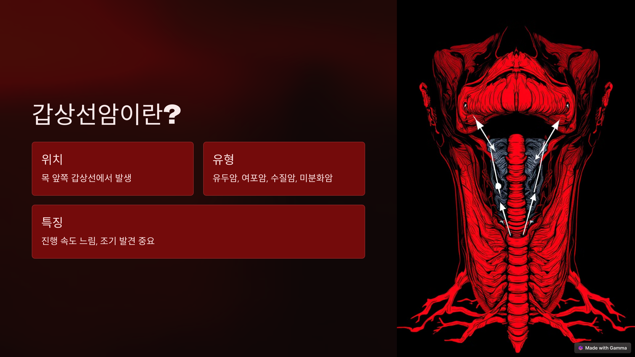 갑상선암은 목 앞쪽에 위치한 갑상선에서 발생하는 암으로, 종류에 따라 진행 속도와 치료 방법이 다릅니다. 가장 흔한 유형은 유두암, 그다음으로 여포암, 수질암, 미분화암 등이 있습니다. 대체로 진행 속도가 느리지만, 조기 발견이 중요합니다.