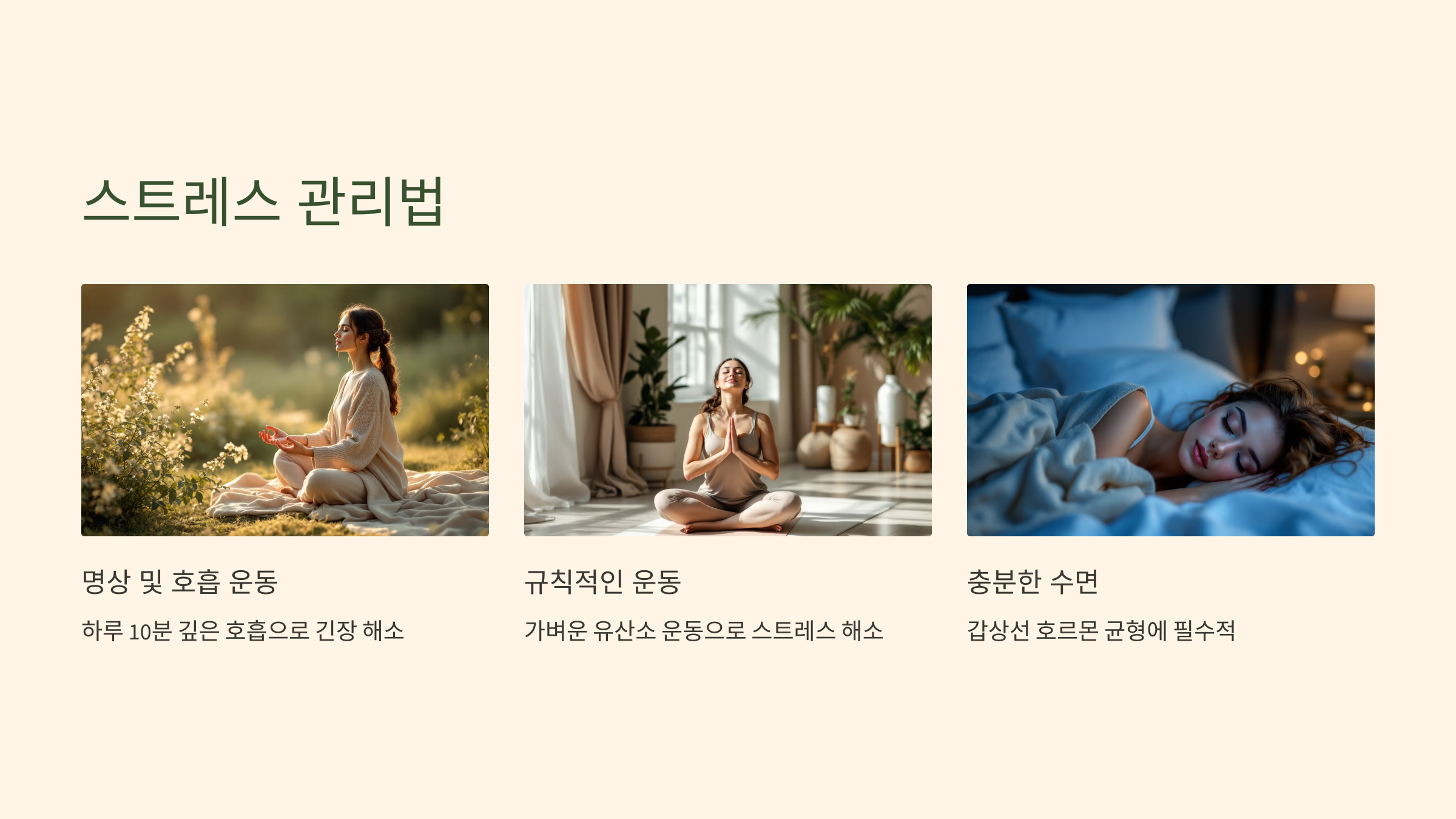 스트레스를 효과적으로 관리하면 갑상선 건강을 유지하는 데 큰 도움이 됩니다. 다음은 쉽고 실천 가능한 스트레스 관리법입니다.