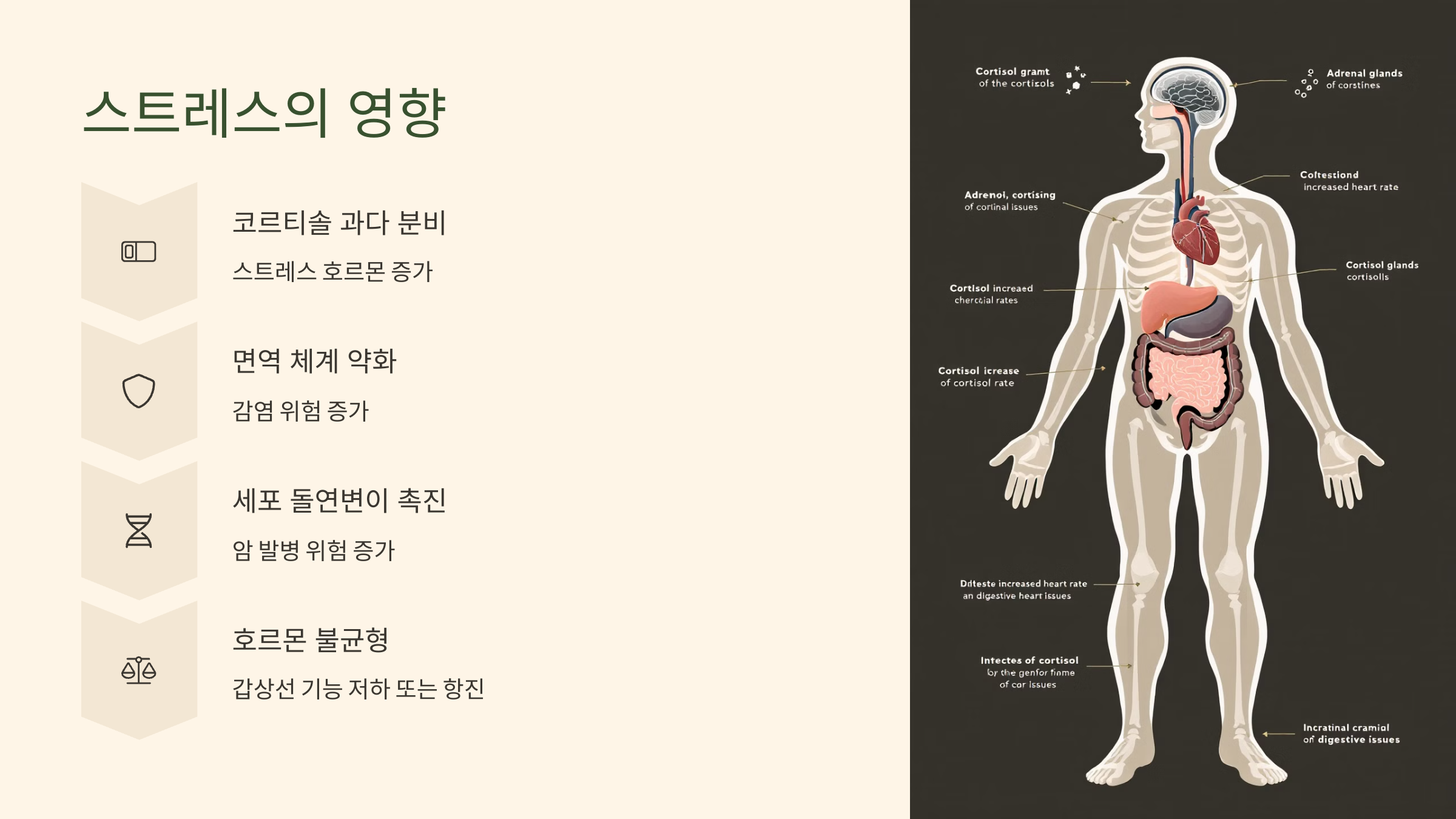 특히, 스트레스가 심하면 코르티솔(스트레스 호르몬)이 과다 분비되는데, 이것이 장기적으로 지속되면 몸의 균형이 깨지면서 여러 가지 건강 문제가 발생합니다.